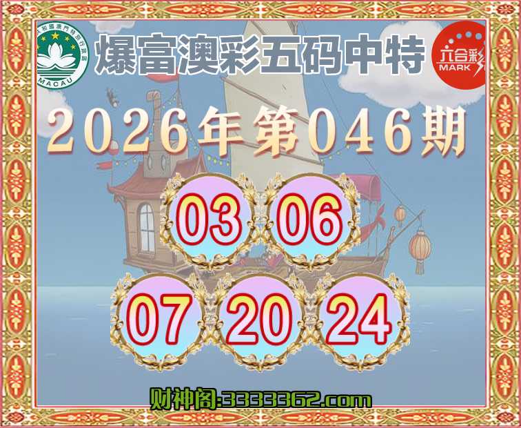 046期:《爆富澳彩》 🚵‍♀️五码中特🚵‍♀️【03.06.07.20.24】开:03