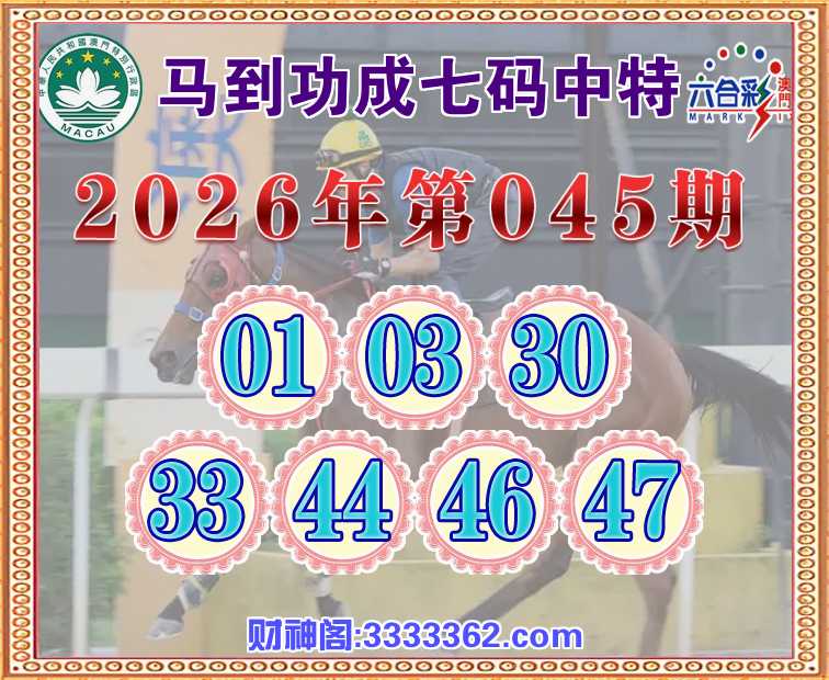 045期:〖马到功成〗 🚡七码中特🚡【01.03.30.33.44.46.47】开:01