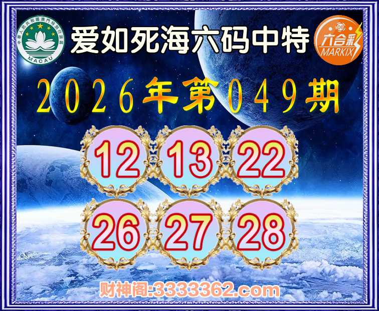 049期:【爱如死海】 🍏六码中特🍏【12.13.22.26.27.28】开:13