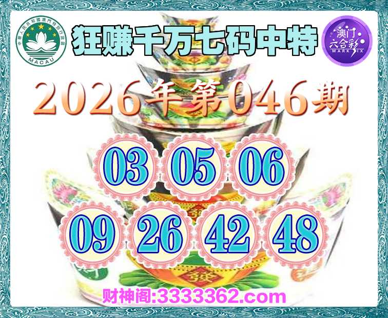 046期:【狂赚千万】 🍧七码中特🍧【03.05.06.09.26.42.48】开:03
