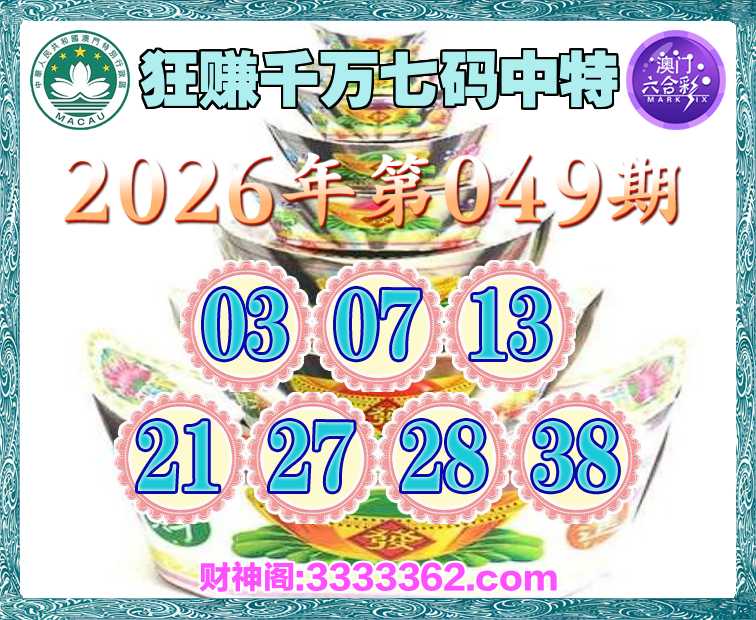 049期:【狂赚千万】 🍧七码中特🍧【03.07.13.21.27.28.38】开:13