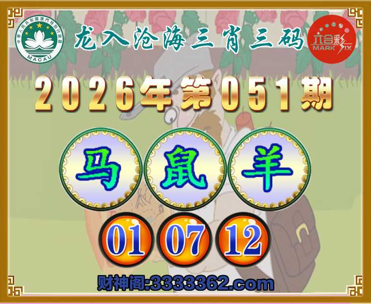 051期:〖龙入沧海〗 🥉三肖三码🥉【鼠羊】【01.07.12】开:马01